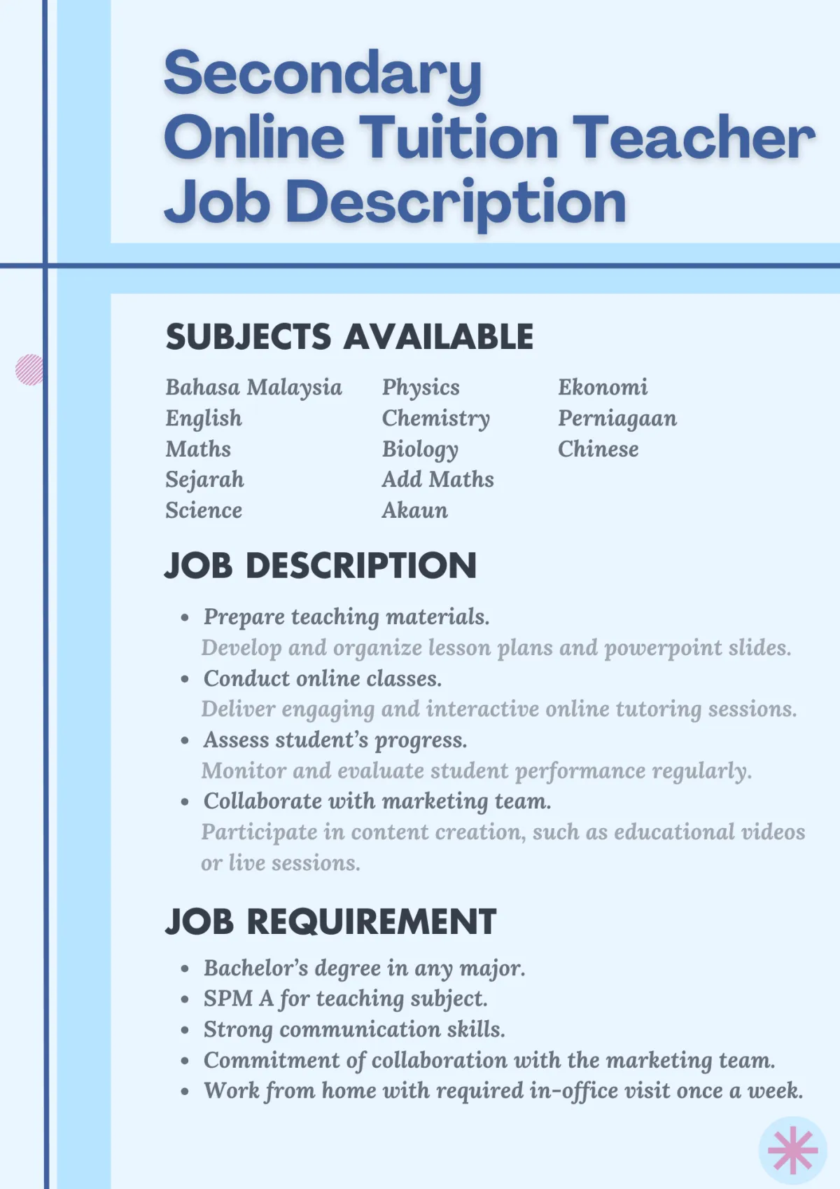 因为我们是中学补习社,我们要求老师至少毕业于Degree,且在该科SPM中取得A(A+、A、A-),这与一般的中学补习中心不一样,只有SPM毕业的话,不能在我们这里任职中学补习老师。